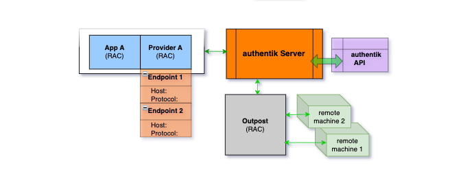 The provider-application pair, the authentik server, and the authentik API are typical to all configurations. With RAC, there are some new components, namely the endpoints, the outpost, and of course the target remote machines.